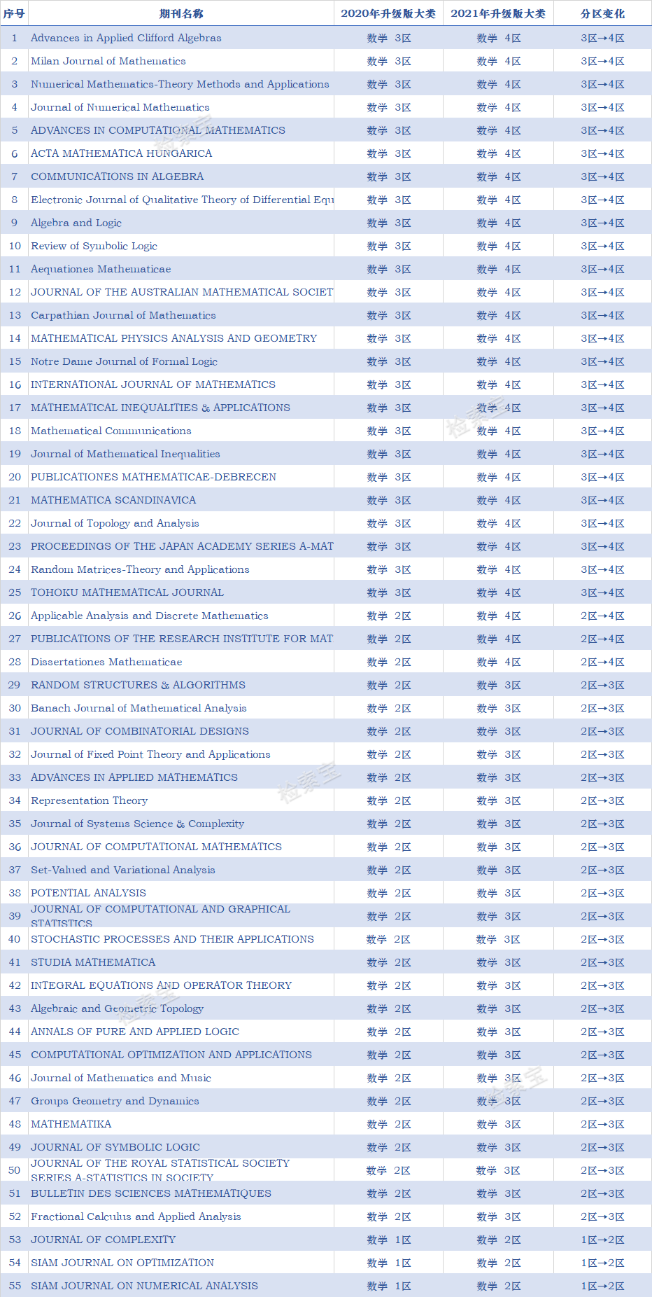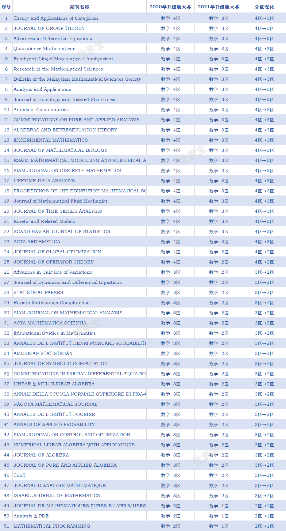 以上就是数学大类下期刊的分区整体变动情况,欢迎大家持续关注。后续我们也会分享更多学科,大家有想了解的学科也可以后台发送给我们,我们会优先整理哟~