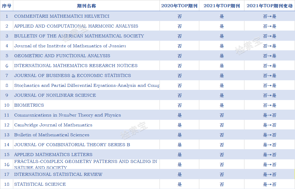 数学有18本TOP期刊发生了变动,其中10本期刊提升为TOP期刊,8本期刊被移除TOP期刊。