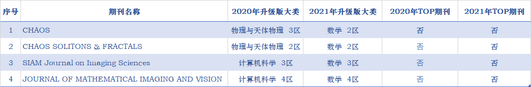 有4本期刊相对比较特殊,升级版大类发生变化,期刊CHAOS和期刊CHAOS SOLITONS & FRACTALS在2020年升级版大类为物理与天体物理,在2021年升级版大类为数学;期刊SIAM Journal on Imaging Sciences和期刊JOURNAL OF MATHEMATICAL IMAGING AND VISION在2020年升级版大类为计算机科学,在2021年升级版大类为数学,对期刊大类有要求的作者还需注意。