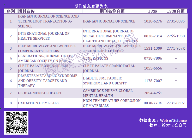 美国时间2月22日更新的Journal List中,SCIE/SSCI期刊数据库剔除(Dropped)或停止检索(Ceased)了12本期刊,被剔除的12本期刊中,有8本期刊是信息更改。期刊变更信息如下。