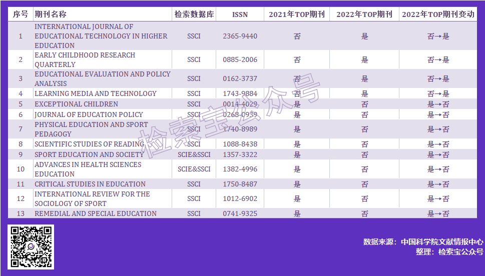 教育学有13本TOP期刊发生了变动,其中4本期刊提升为TOP期刊,9本期刊被移除TOP期刊。