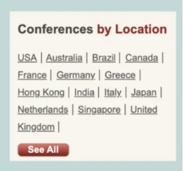 http://www.allconferences.com/Allconferences也是这个相当相当全面的大会搜索网站,而且覆盖了多个学科。