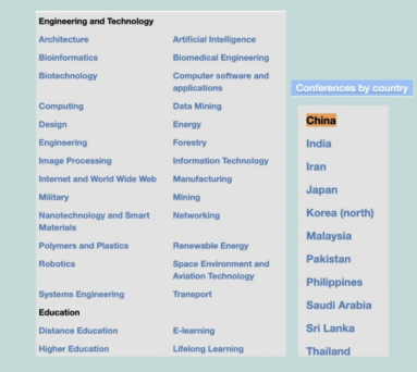 不仅可以按照学科搜索,更可以查看在某个国家的举办的学术会议。