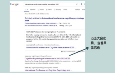 因为参加学术会议肯定是级别越高越好,所以我们要搜索international conference.比如,我想知道2021年,认知心理学领域下有哪些国际大会,则可搜:international conference cognitive psychology 2021直接就会出现很多结果了。