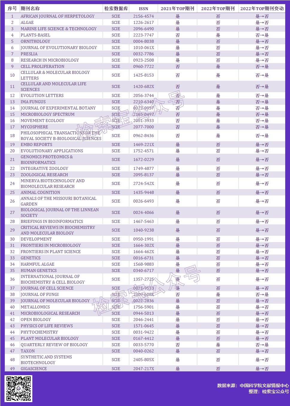 生物学大类有49本TOP期刊发生了变动,其中13本期刊提升为TOP期刊,36本期刊被移除TOP期刊。