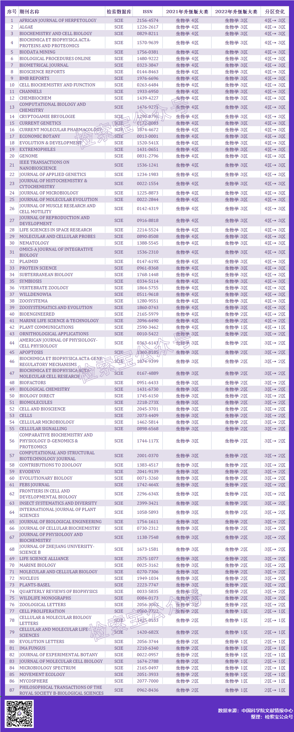 生物学大类下共有87本期刊分区提升,其中11本期刊提升为1区,有1本期刊从4区提升到1区,期刊是PLANT COMMUNICATIONS。论文已经录用的作者恭喜了。下图是分区提升的期刊列表。