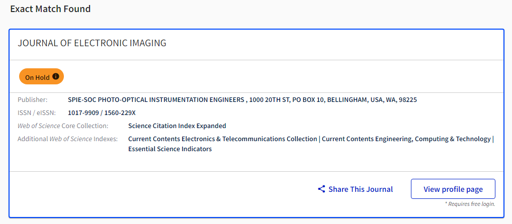 但在Master Journal List中查询后,小编惊奇的发现:JOURNAL OF ELECTRONIC IMAGING这本期刊的on hold标识已经没有了,解除on hold状态,恢复“自由身”了!