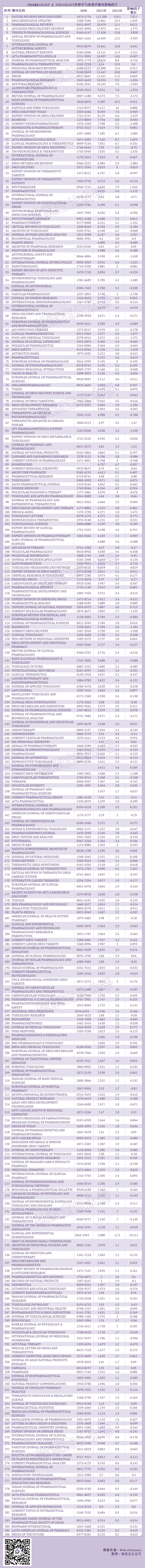 为了让大家更好的了解期刊,我们接下来将以22个ESI学科为基础,为大家整理各个学科的影响因子变化情况,今天分享的是PHARMACOLOGY & TOXICOLOGY药理学与毒理学的286本期刊影响因子变化。